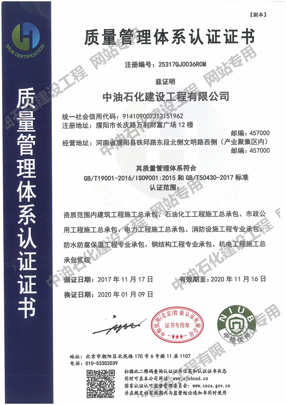 质量管理体系认证证书